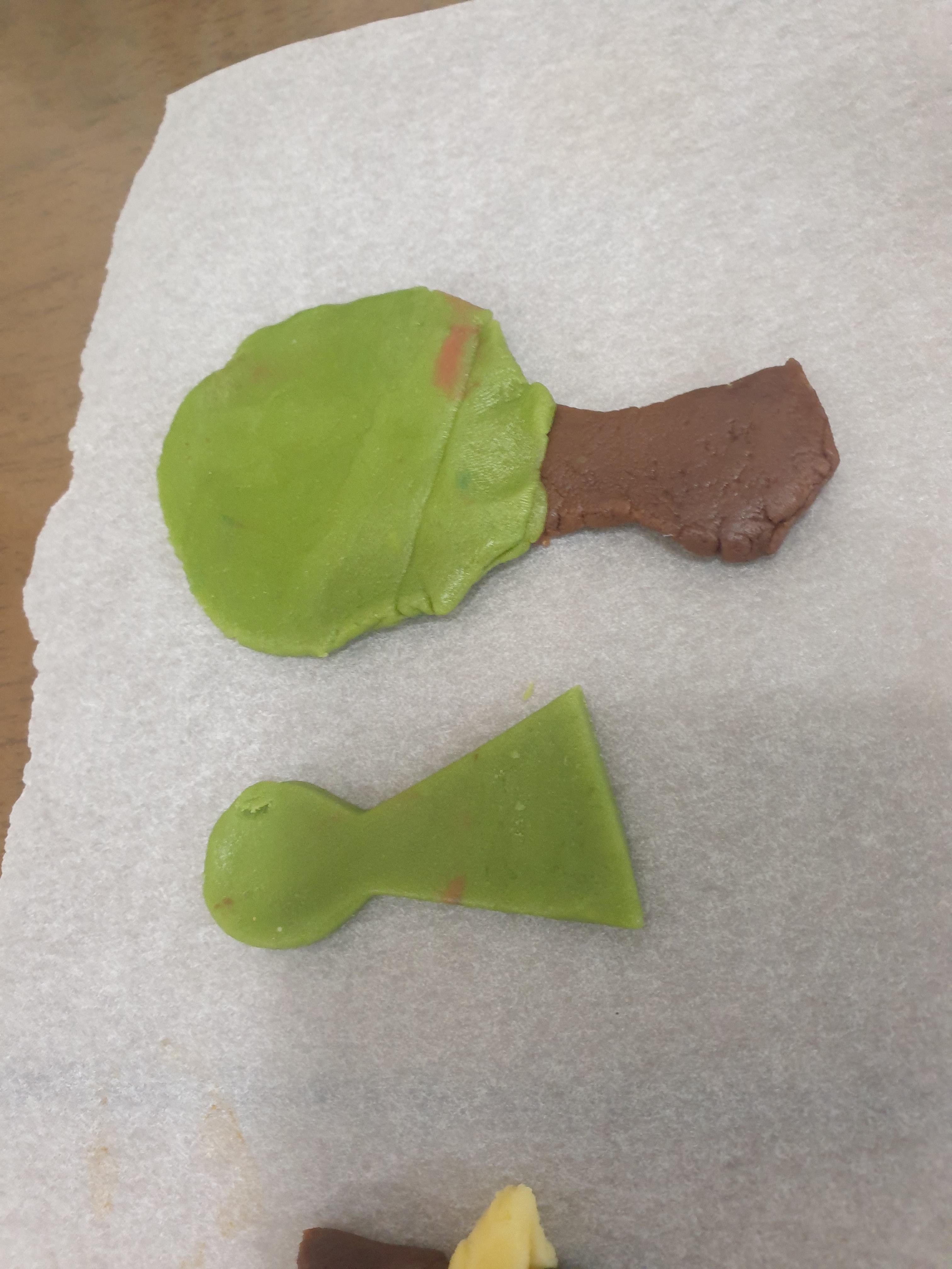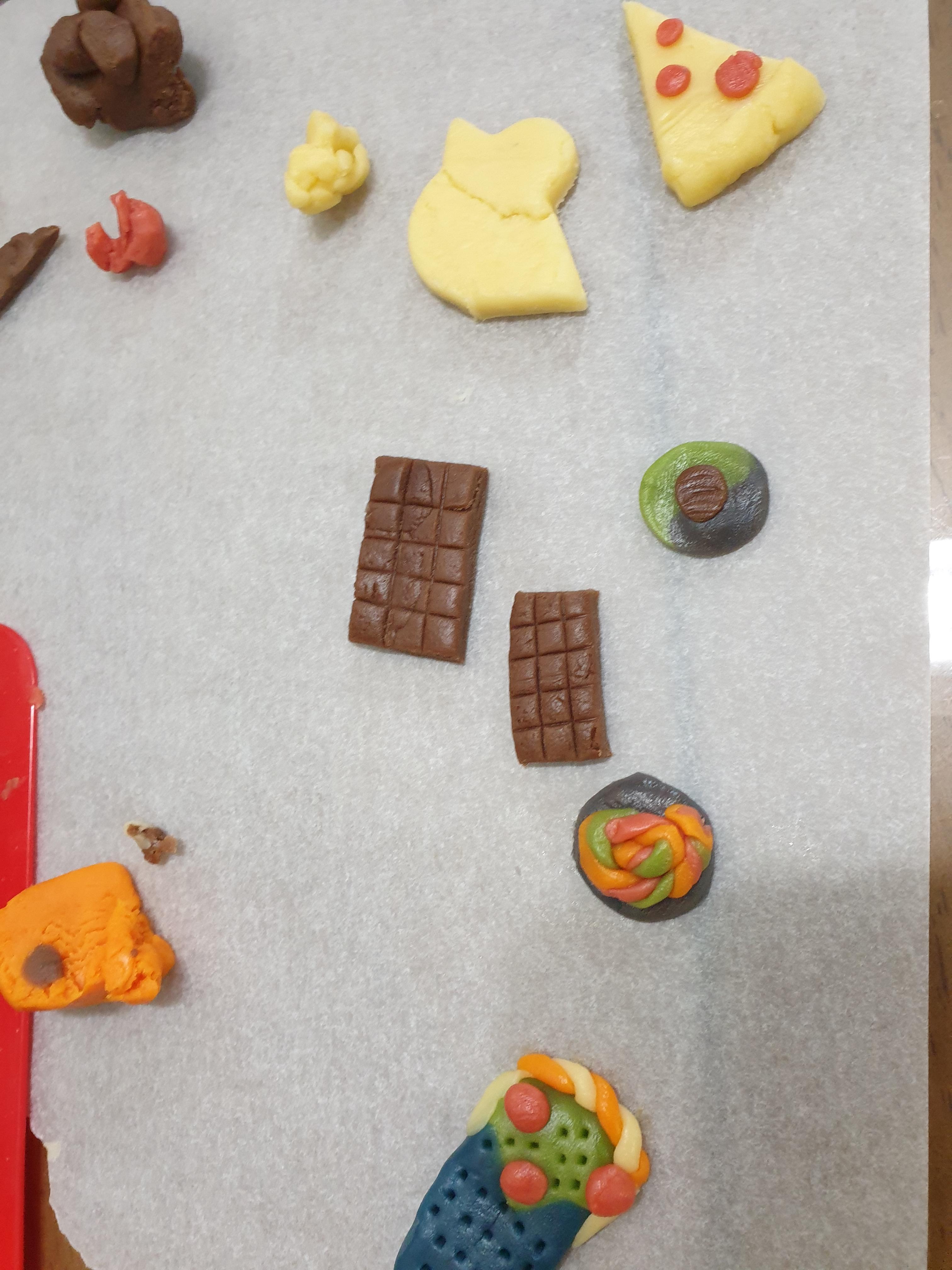 나도 아이들을 따라 만들어보았다. 위의 초콜릿 모양 두 개 빼고 하단의 난해한 작품 2개가 내 것이다.
